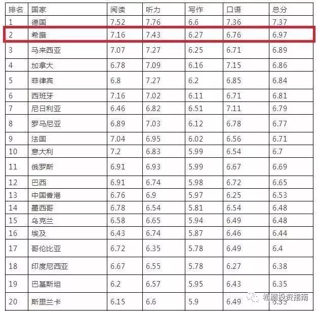 2017年雅思(母語為非英語國家)A類考生成績排名,希臘全球第二。